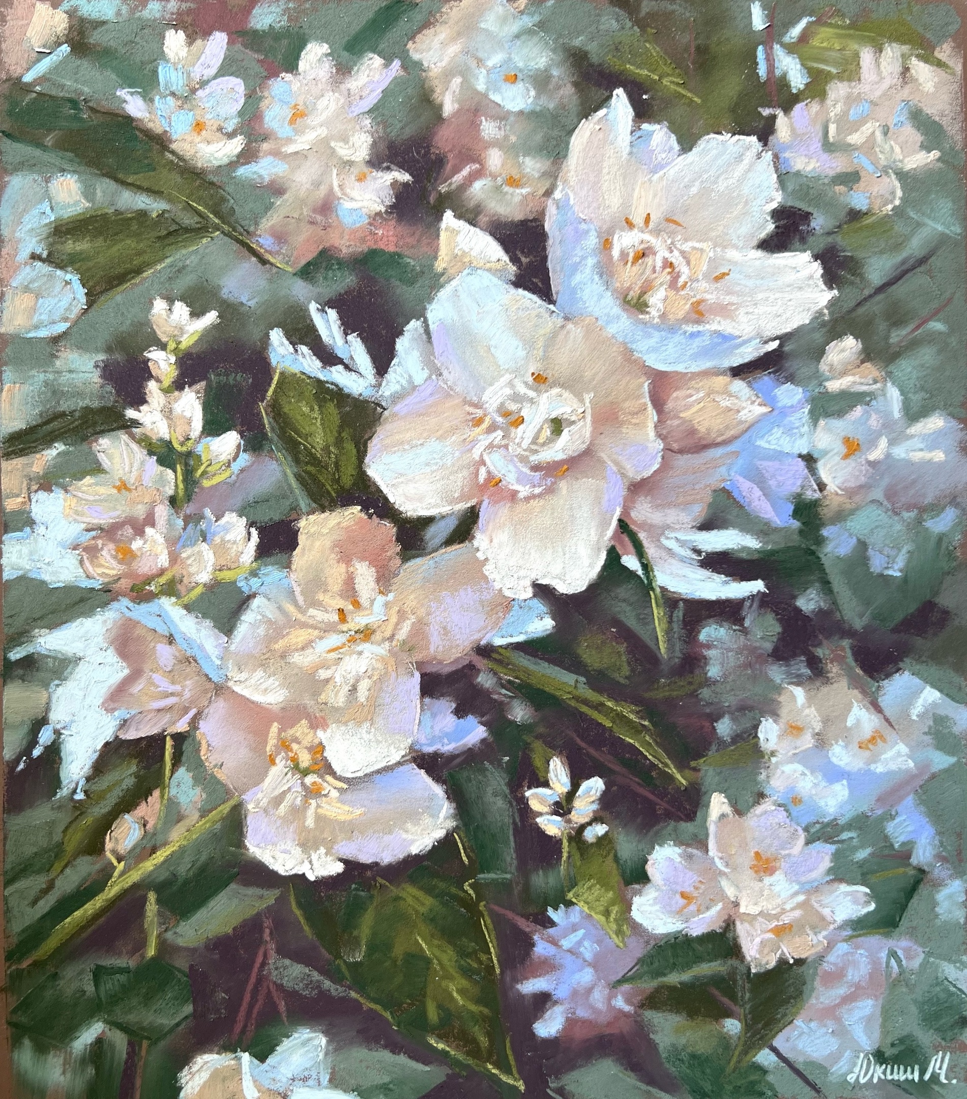 Жасмин. В этом сюжете белые цветы жасмина на фоне темных зеленых листьев создают непростую задачу - найти правильный контраст и соблюсти цветовую гармонию.