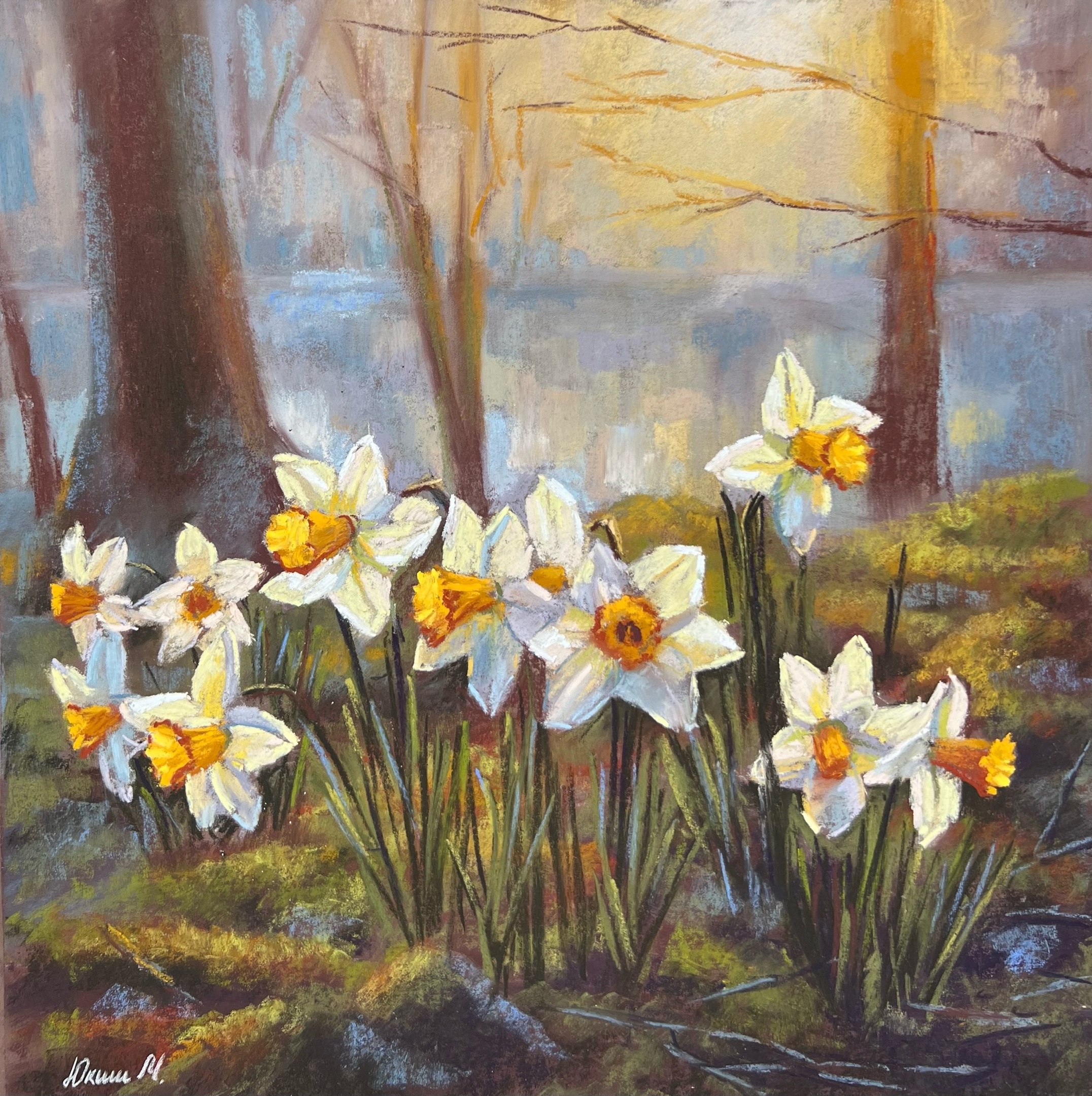 На курсе вы научитесь рисовать сухой пастелью реалистичные цветы в атмосфере весны на примере —нарцисса, ириса и камелии.