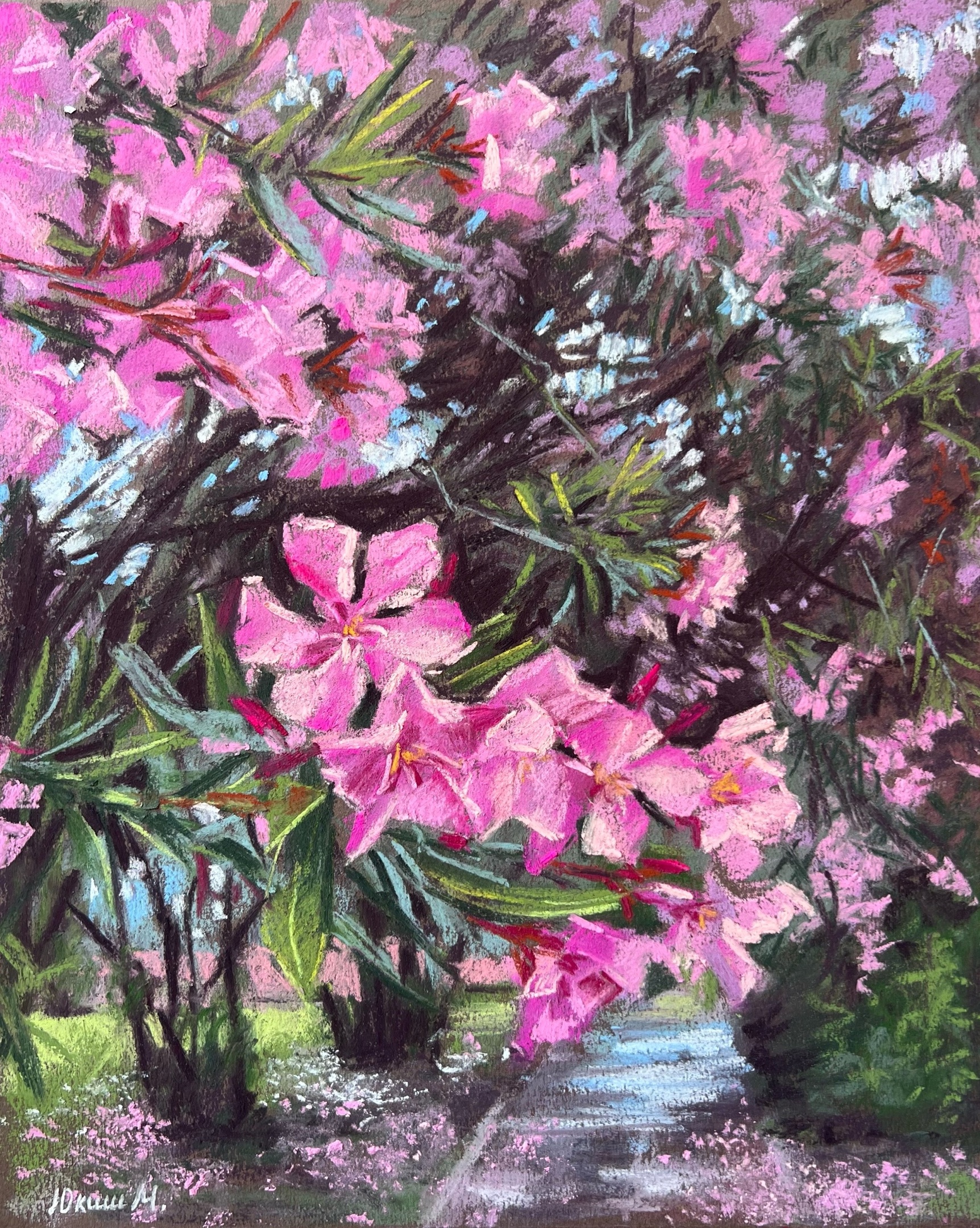 Олеандр. Заросли олеандра, дорожка, усыпанная цветами, идеальное сочетание розового и зеленого - создают весеннее настроение с акцентом на свежесть и красоту природы. Обсудим, какими средствами можно разделить планы, выделить главное и создать глубину, порисуем новую форму цветов и листьев.