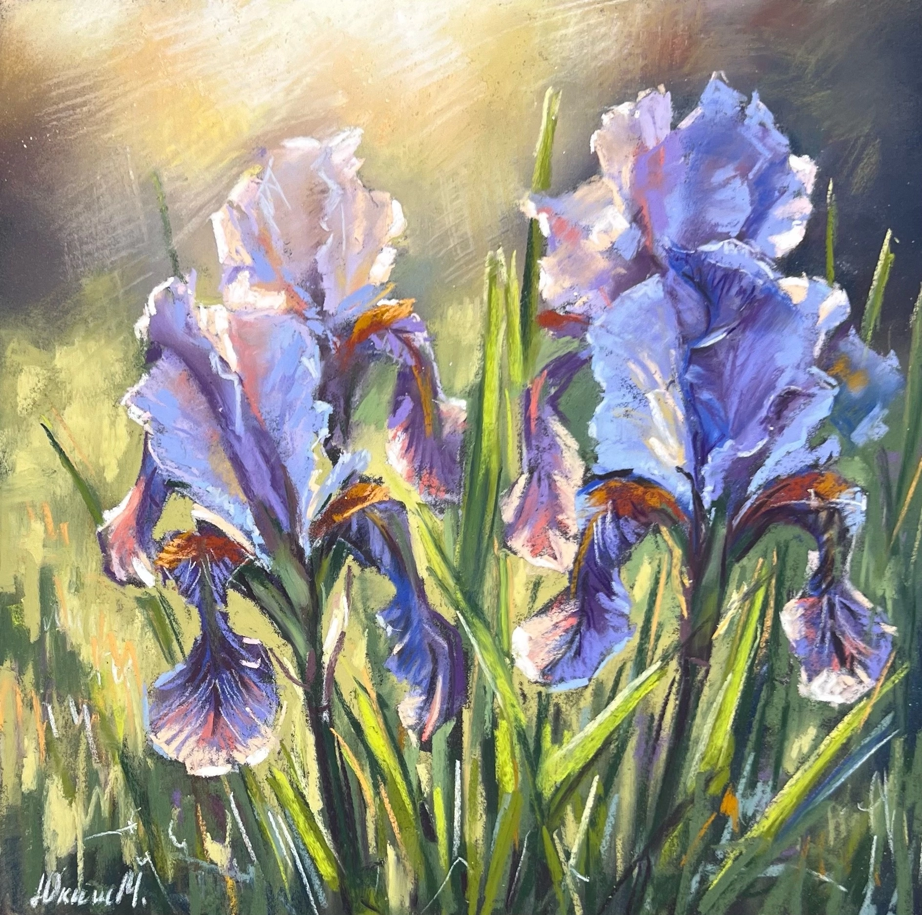 Ирисы в лучах заходящего солнца. Размытый фон и свет подчеркивают нежность и изящную форму цветов. Задачей урока будет не только реалистично нарисовать ирисы, но и передать образ этого цветка. Научиться рисовать траву и работать с зеленым цветом.