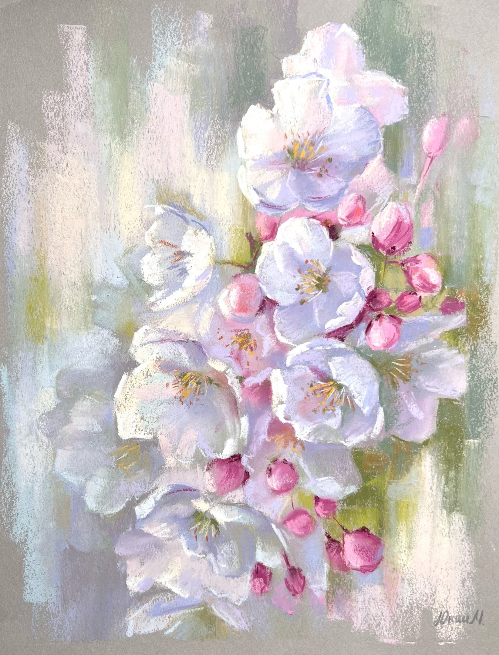 Цветущая веточка. Нас ждет очень "пастельная", чувственная, тонкая и нежная работа. Будем рисовать от пятна, работать на небольшом контрасте, научимся изображать открытые и закрытые бутоны, постараемся передать шелковистые лепестки цветов.