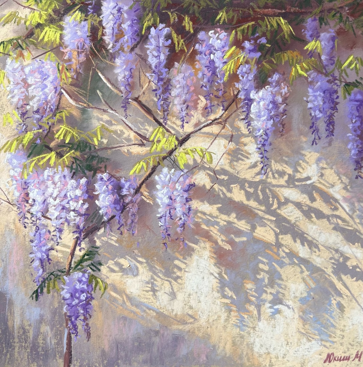 Глициния. Освещенные солнечным светом, пышные грозди глицинии создают ажурный узор тени на стене. Свет и тень играют важную роль в композиции, становятся полноправным участником сюжета. И нам нужно найти баланс между красивыми цветами и живописной тенью, так чтобы они дополняли друг друга и не спорили за внимание зрителя. И помимо цветов, в этой работе мы потренируемся рисовать изящные ветки.